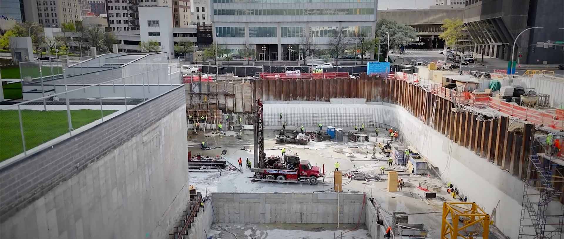 Allied Geothermal crew practicing safe processes around drilling equipment at an active construction site.